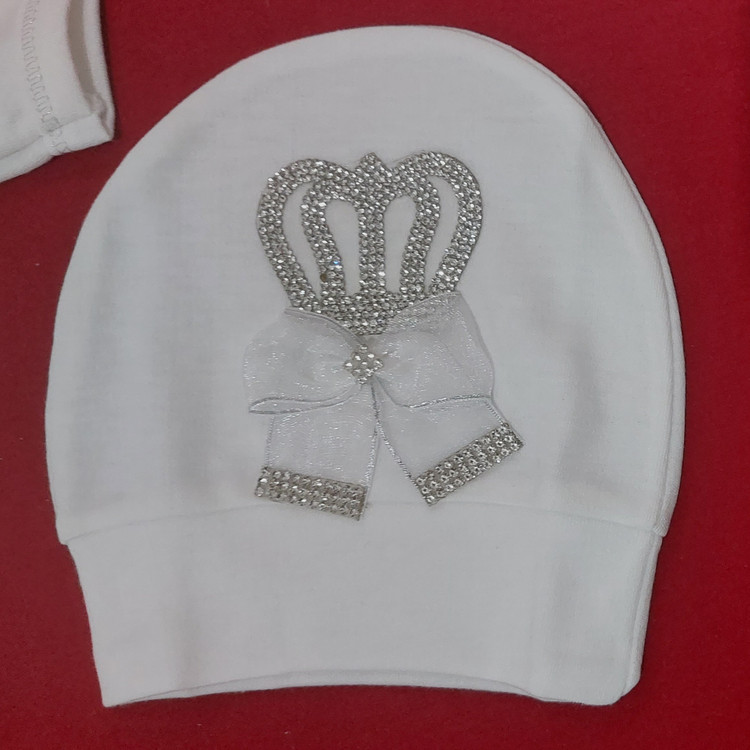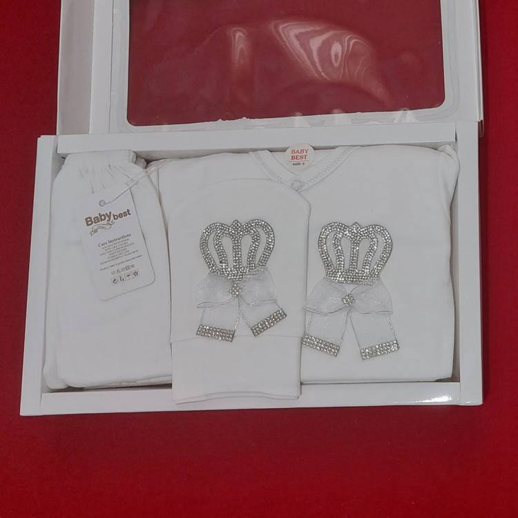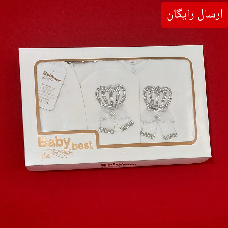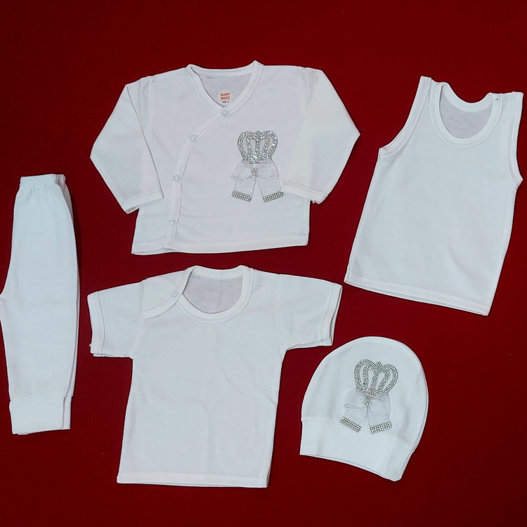 لباس نوزادی پنج تکه طرح تاج خاص سفید رنگ سایز 0 ، 1 و 2 ( با ارسال رایگان به سراسرکشور )