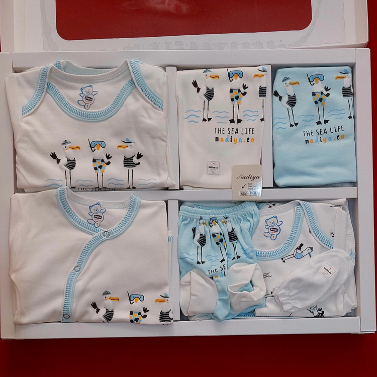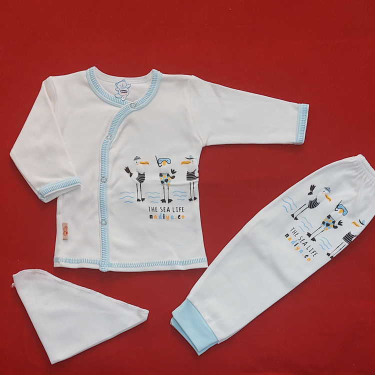 ست 19 تکه بیمارستانی نوزادی پنج ستاره قواره دار جنس تمام پنبه خالص ( با ارسال رایگان ) سایز 1 طرح پرنده های بازیگوش