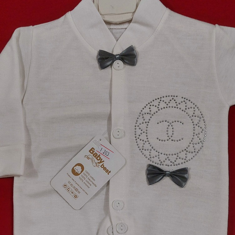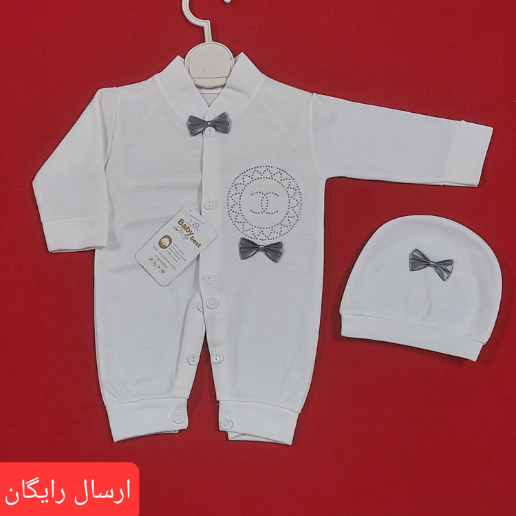 لباس نوزادی سرهمی نوزادی طرح خاص پاپیون طوسی رنگ ( مناسب بیمارستان و بدو تولد ) با ارسال رایگان