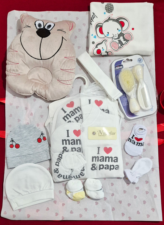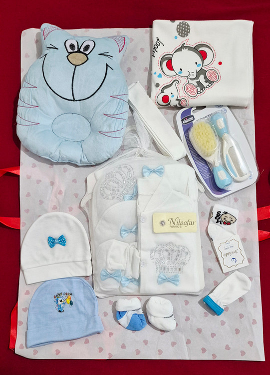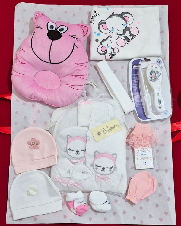 شامل ست 7 تکه نوزادی ،بالشت شیر دهی ،پارچه قنداق،بند قنداق،ست شانه و برس،2 جفت جوراب بدو تولد، یک جفت جوراب طرح دار،یک جفت دستکش، 2 عدد کلاه